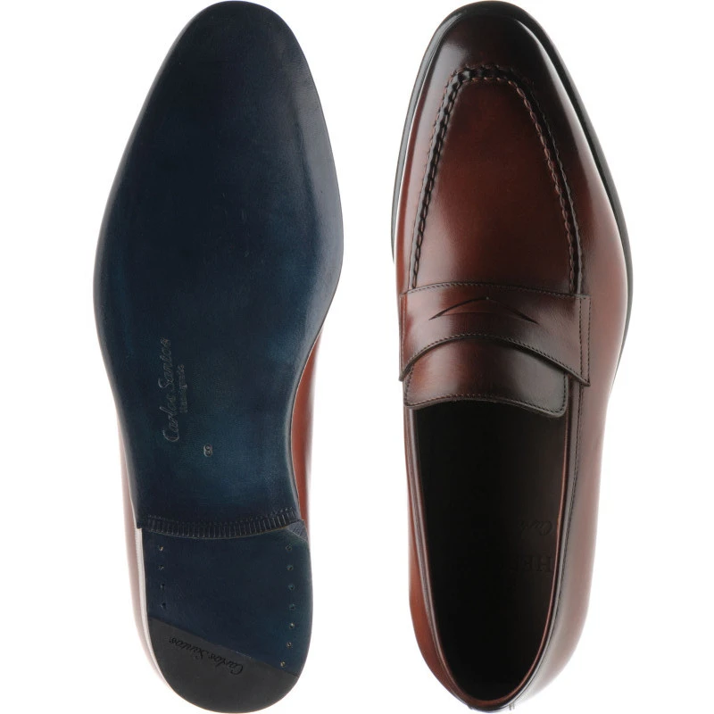 Cadogan is a stunning apron loafer with a handsewn front, featuring an exclusive blue sole made specifically for us. With the in-channel stitched sole and thin waist this is a modern classic that wouldn’t be out of place in any high-end wardrobe. Please note that all closed-channel or in-channel stitching will eventually become visible with wear as the leather is worn away. These shoes are hand-patinated individually in the Carlos Santos factory so there can be a small variation of colour from the shoes you receive to the picture on the website. We always strive to get consistency but in a hand-patinated product this is not always possible and is a sign of quality. Please note that we would only advise using a gentle wax-based cream or polish to protect carefully hand-finished shoes such as these. Harsh products such as renovating creams, high solvent based products and rain protectors may strip the carefully applied finish. If this happens we will not be able to refund the shoes although we may be able to get them re-finished at the factory for you at your cost. |