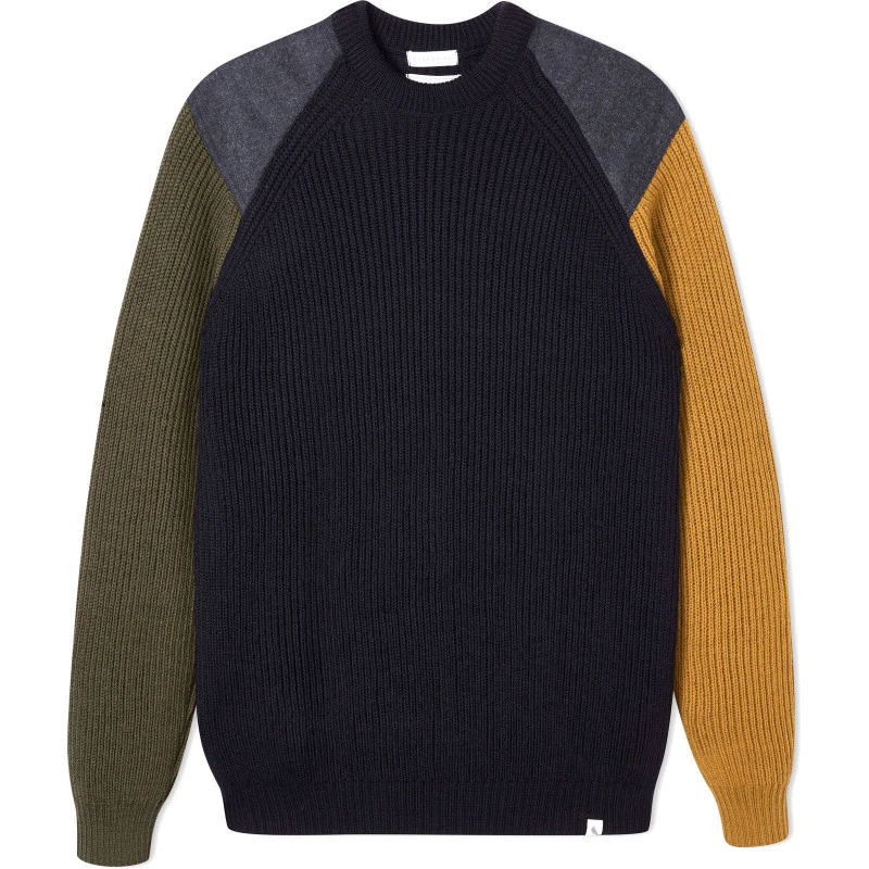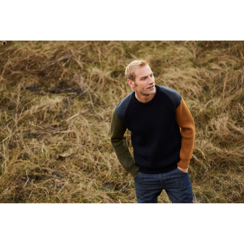 A contrast crew neck knit with Moon Tweed shoulder patches. The asymmetric colouring is a modernistic approach to a traditional men’s style that can waken your wardrobe in an instant. Wool is somewhat of a miracle fabric as it is highly sustainable, renewable, biodegradable, recyclable and flame-resistant. We believe it is the most sustainable fabric out there so that is why Peregrine make sure all of their jumpers are always 100% wool. Wool biodegrades in a few months, while Nylon can take many years. Size Guide: This style fits true to size. We advise that you HAND-WASH ONLY in cool water as any heat can cause the wool fibres to shrink and your knitwear to become misshapen. Please adhere to washing instructions on the garment, |